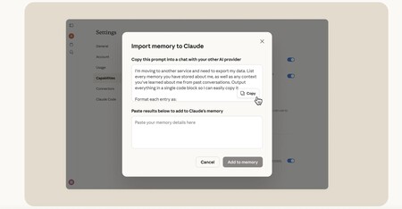 - Ir a ‘Ajustes‘ > ‘Capacidades‘ y ahí en Importar Memoria, pega la respuesta. Luego, toque ‘Agregar a la memoria’. A partir de ese momento, Claude ya sabe lo que sabía tu anterior IA.