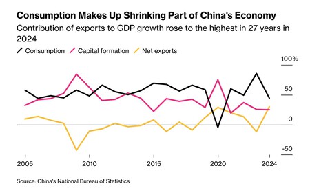 Y hay otro problema: como señalan en BloombergChina es el mayor exportador del mundo, precisamente porque su consumo interno es insuficiente: producen mucho más de lo que necesitan. La contribución de las exportaciones al PIB del país está aumentando, pero el consumo se ha estancado o caído.