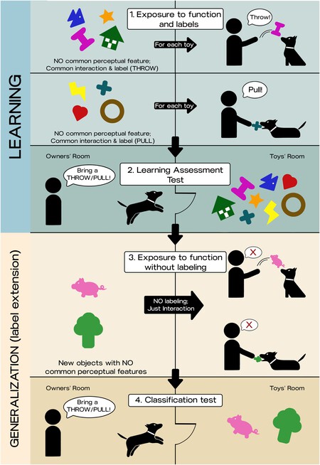 Aprendiendo las reglas. Para saber si los perros pueden ir más allá del simple reconocimiento visual, los investigadores diseñaron un ingenioso experimento de cuatro fases. El primero se centra en los perros que aprenden lo que tendrán que hacer. Para hacer esto, los propietarios les enseñaron a sus perros dos etiquetas verbales para dos grupos de juguetes. Por ejemplo, a un conjunto de cuatro objetos se les asignó la etiqueta ‘Throw’ y la única interacción fue el juego de la tira y se afloja.