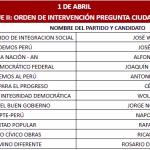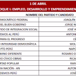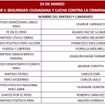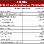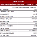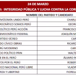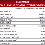 Finalmente, el 1 de abril se reunirán Ricardo Belmont (Partido Cívico Obras), Rafael Belaunde (Libertad Popular), José Luna (Vamos Perú), César Acuña (Alianza para el Progreso), Wolfgang Groso (Integridad Democrática) y Rosario Fernández (Un Camino Diferente). Asimismo, Jorge Nieto (Partido Buen Gobierno), Armando Massé (Partido Demócrata Federal), Alfonso López-Chau (Ahora Nación), Antonio Ortiz (Salve Perú), Napoleón Becerra (Partido de los Trabajadores y Empresarios), José Williams (Avanza País).