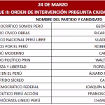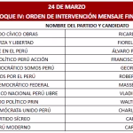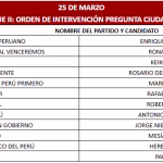 Para la segunda fecha –24 de marzo– deberán asistir George Forsyth (Somos Perú), Roberto Sánchez (Juntos por el Perú), Carlos Jaico (Perú Moderno), Carlos Espá (Partido Sí Creo), Vladimir Cerrón (Perú Libre Libre) y Charlie Carrasco (Partido Democrático Unido del Perú). Asimismo, Francisco Diez-Canseco (Perú Acción), Ricardo Belmont (Partido Cívico Obras), Walter Chirinos (PRIN), Armando Masse (Partido Demócrata Federal), Fiorela Molinelli (Fuerza y Libertad) y Álvaro Paz de La Barra (Religión en Perú).