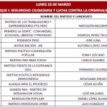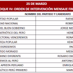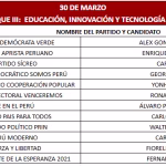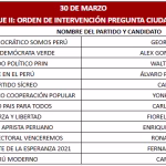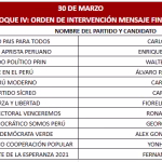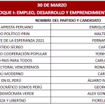Lunes 30 de marzo, Carlos Jaico (Perú Moderno), George Forsyth (Somos Perú), Álvaro Paz de la Barra (Fe en Perú), Fiorella Molinelli (Fuerza y Libertad), Alex González (Demócrata Verde), Carlos Espá (Yo Creo), Yonhy Lescano (Cooperación Popular (N), Ronald Atmosrecooperación (N), Ronald Atmosre (Cooperación Vopular), Fernando Olivera (Frente de Esperanza 2021), Carlos Álvarez (Tierra para Todos) y Enrique Valderrama (Partido Aprista Peruano)