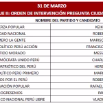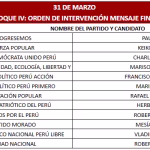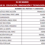 El martes 31 de marzo estarán Herbet Caller (Partido Patriótico del Perú), Mesías Guevara (Partido Morado), Roberto Sánchez (Juntos por el Perú), Paul Jaimes (Progresemos), Keiko Fujimori (Fuerza Popular), Rafael López Aliaga (Renovación Popular). También Marisol Pérez Tello (Primero el Pueblo), Mario Vizcarra (Primero el Pueblo), Charlie Carrasco (Partido Democrático Unido), Vladimir Cerrón (Perú Libre), Francisco Diez Canseco (Partido Perú Acción), Roberto Chiabra (Unidad Nacional).