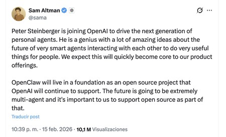 La era de los agentes de IA personalizados. Sam Altman, director ejecutivo de OpenAI, confirmó la noticia en X. Allí indicó que el creador de OpenClaw se había unido a OpenAI «para liderar la próxima generación de agentes personales», y destacó que «esperamos que esto [los agentes personalizados de IA] se convertirá rápidamente en una parte integral de nuestra oferta de productos.» Además, aseguró que OpenClaw seguirá siendo de código abierto, algo que probablemente fue una de las condiciones esenciales que Steinberger puso para unirse a las filas de OpenAI.