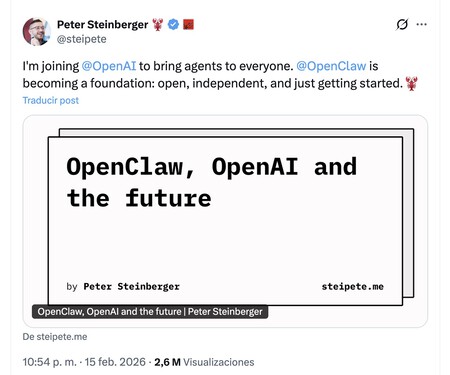 Un creador que no quería ser CEO. Steinberger explicó en su post cómo su proyecto le abrió «una infinita serie de posibilidades», y confesó que «sí, realmente pude ver que OpenClaw podría haberse convertido en una empresa gigante. Pero no, no estoy entusiasmado con eso. Soy un creador de corazón». Steinberger ya creó una empresa y le dedicó 13 años de su vida, y «lo que quiero es cambiar el mundo, no crear una gran empresa, y asociarse con OpenAI es la forma más rápida de llevar esto al mundo entero».